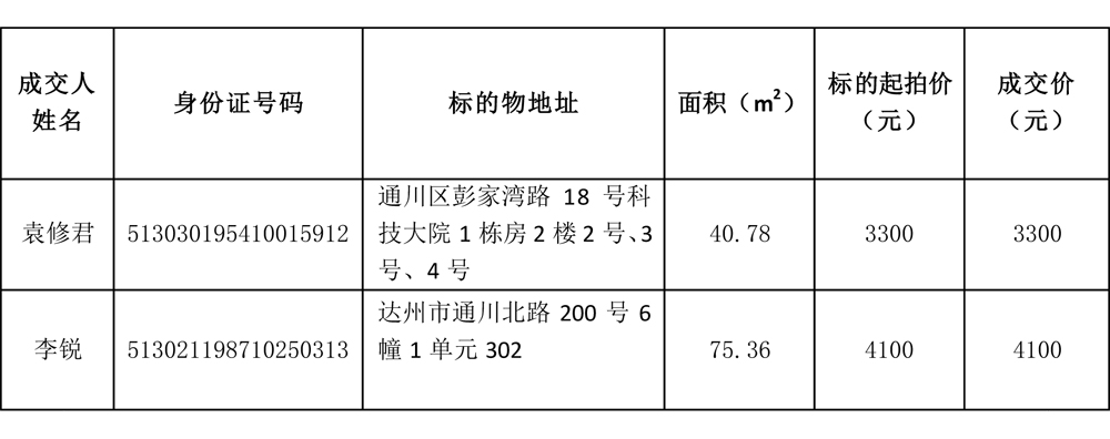 按照市國資委《關(guān)于印發(fā)達(dá)州市屬國有企業(yè)資產(chǎn)出租管理辦法的通知》(達(dá)市國資委發(fā)〔2019〕251號)相關(guān)規(guī)定,達(dá)州市投資有限公司于2023年11月3日以現(xiàn)場競價(jià)方式在達(dá)州市投資有限公司5樓會議室對參與報(bào)名的2宗國有資產(chǎn)進(jìn)行公開競價(jià),現(xiàn)將成交結(jié)果公示如下: